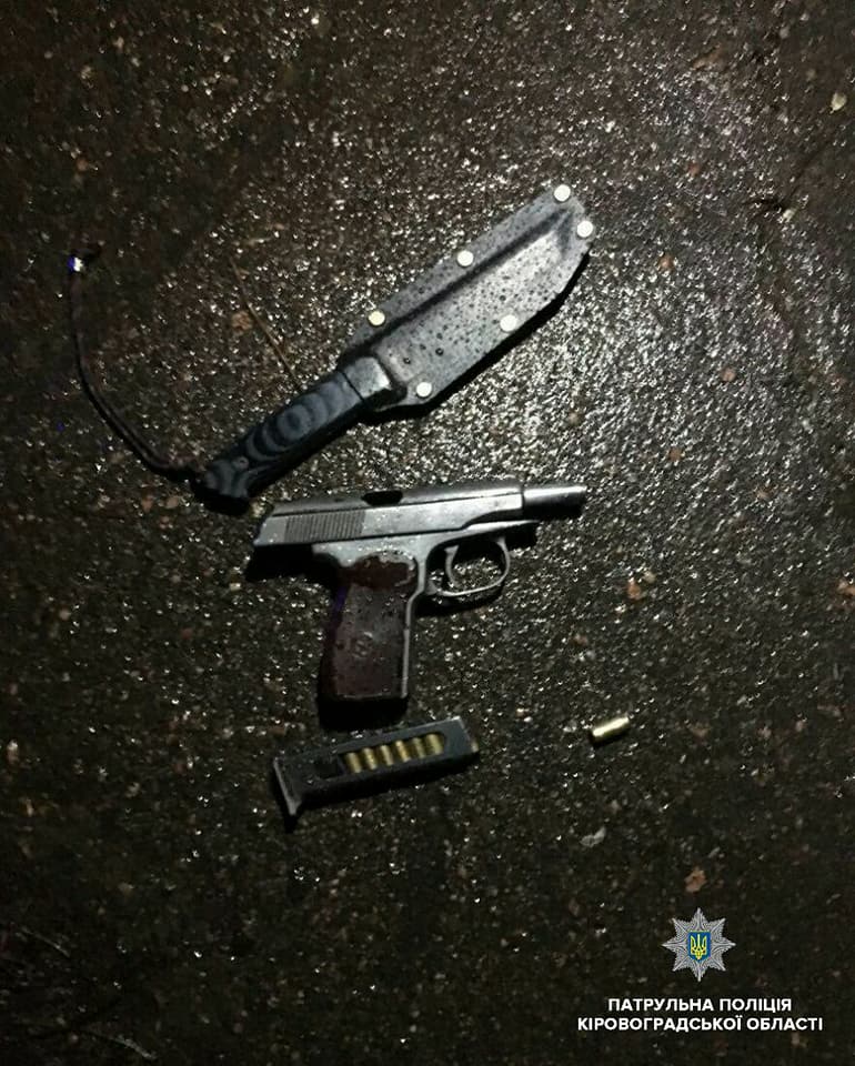Відповідно до ст. 34 ЗУ «Про національну поліцію» патрульні провели поверхневу перевірку другого пасажира, під час якої виявили предмети, схожі на ніж та зброю із патроном у патроннику. На вимогу поліцейських чоловік пред’явив дозвіл на право зберігання і носіння пристрою для відстрілу гумових куль.