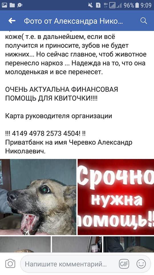 У п’ятницю, 13 липня, з акаунту на ім’я Александр Николаевич був опублікований допис про збір коштів на порятунок собаки Квіточки, яка декілька місяців тому отримала рвані рани щелепи, коли невідомі змусили її з’їсти петарду. У тексті чоловік вказав номер картки Приватбанку, на яку потрібно було переводити кошти. Отримувачем значився Черевко Олександр Миколайович.