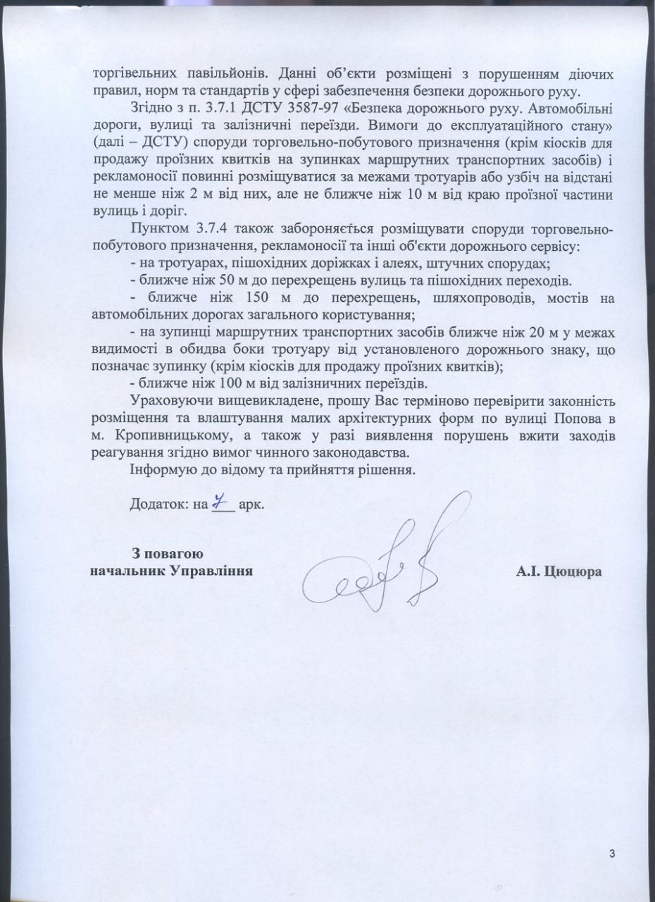 Управління патрульної поліції 10 квітня навіть направило лист на ім’я міського голови Андрія Райковича з проханням терміново перевірити законність розміщення та влаштування МАФів по вул. Попова і вжити відповідних заходів у разі виявлення порушень.