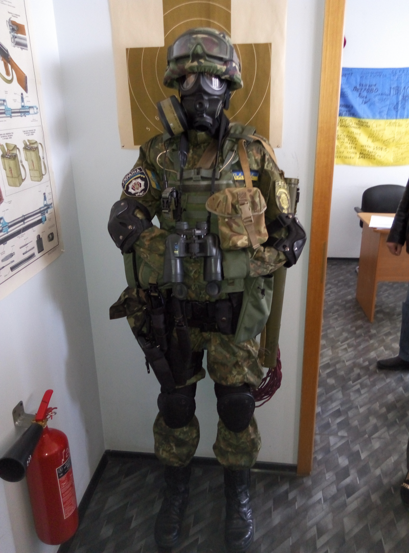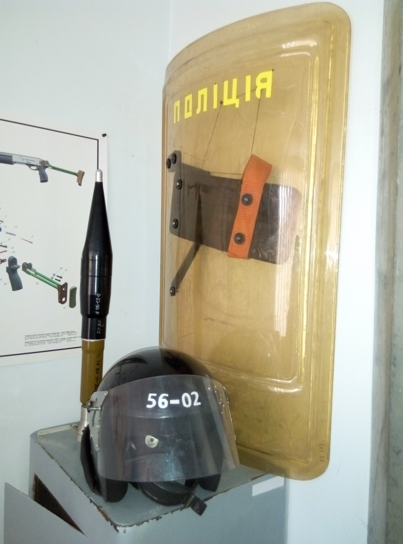 Антон Цюцюра показав присутнім також кімнату, де зберігаються макети деяких видів озброєння та спецзасобів колишньої міліції. У цій кімнаті, крім макетів гранатометів та міліцейських щита і каски розташований досить цікавий експонат – екіпірований манекен, якого полісмени називають “Альона Робертівна”.