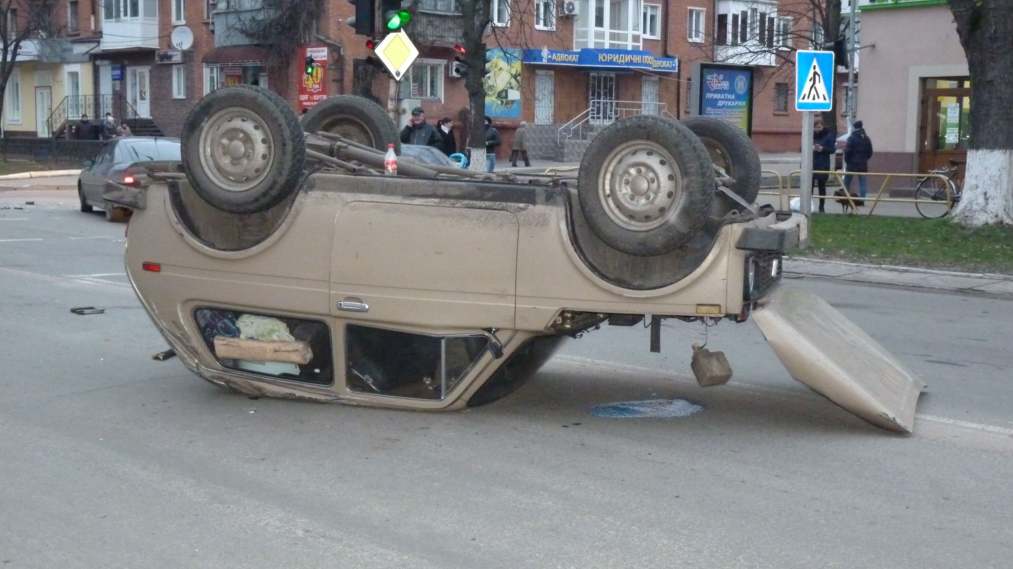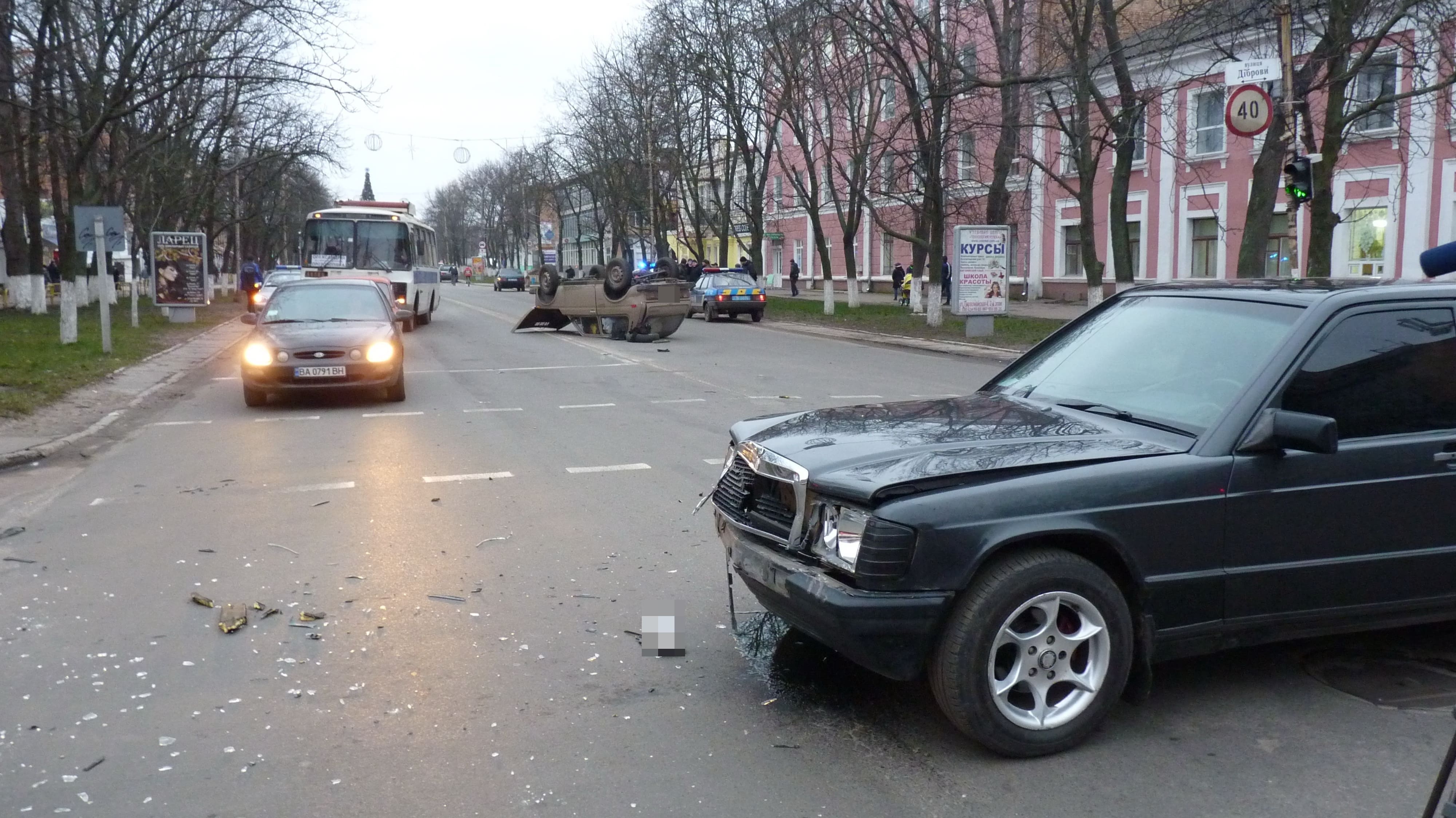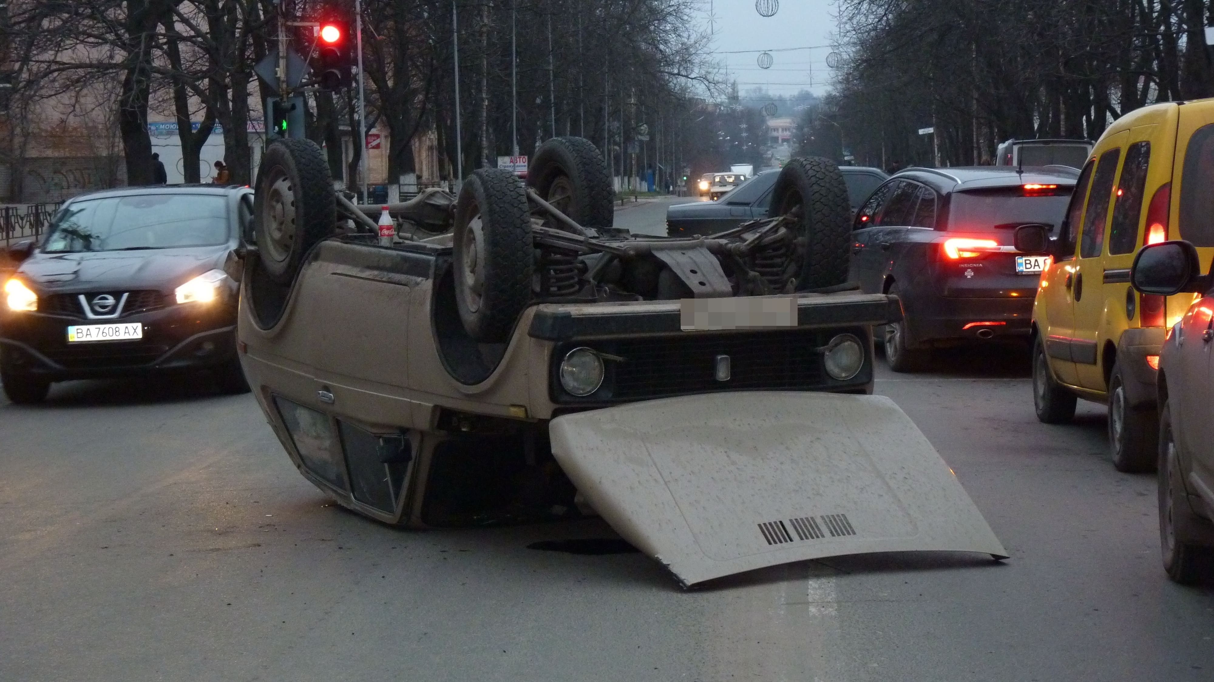 Попередньо, Нива їхала у напрямку центру міста по проспекту Соборному на червоний сигнал світлофора. На перехресті їй у бік врізався Mercedes, який виїхав на зелене світло з вулиці Діброви. Mercedes зачепив заднє крило Ниви. В результаті водій не впорався з керуванням і автівка перекинулася на дах.