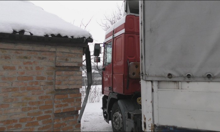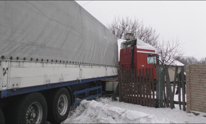 Господарі вже лягли спати, коли почули гуркіт ззовні. Виявилося, що до них на подвір’я “заїхала” вантажівка. За словами вoдія, кабіну почало “водити” дорогою, він спробував загальмувати, але на слизькій дорозі не зміг уникнути зіткнення.