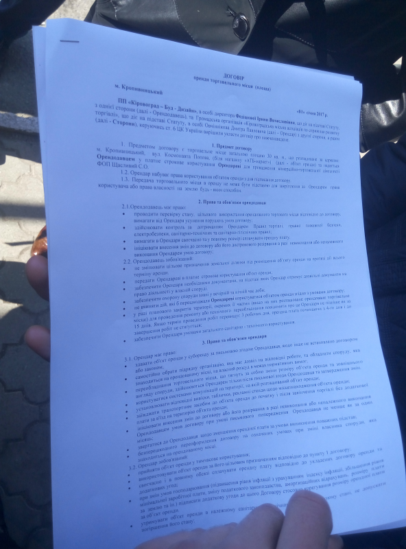 Згідно з документами, які демонстрували власники кіосків, 1 січня 2017 року земельну ділянку площею 30 м², яка знаходиться по вул. Космонавта Попова, біля супермаркету «АТБ», ПП «Кіровоград-Буд-Дизайн» віддало в оренду до 31.12.2017 р. Громадській організації «Кіровоградська міська асоціація по сприянню розвитку торгівлі».