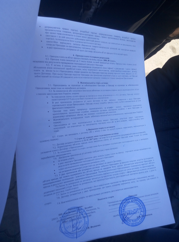Через деякий час він продемонстрував присутнім паспорт прив’язки тимчасової споруди і договір оренди на торгівельне місце площею 30 м².